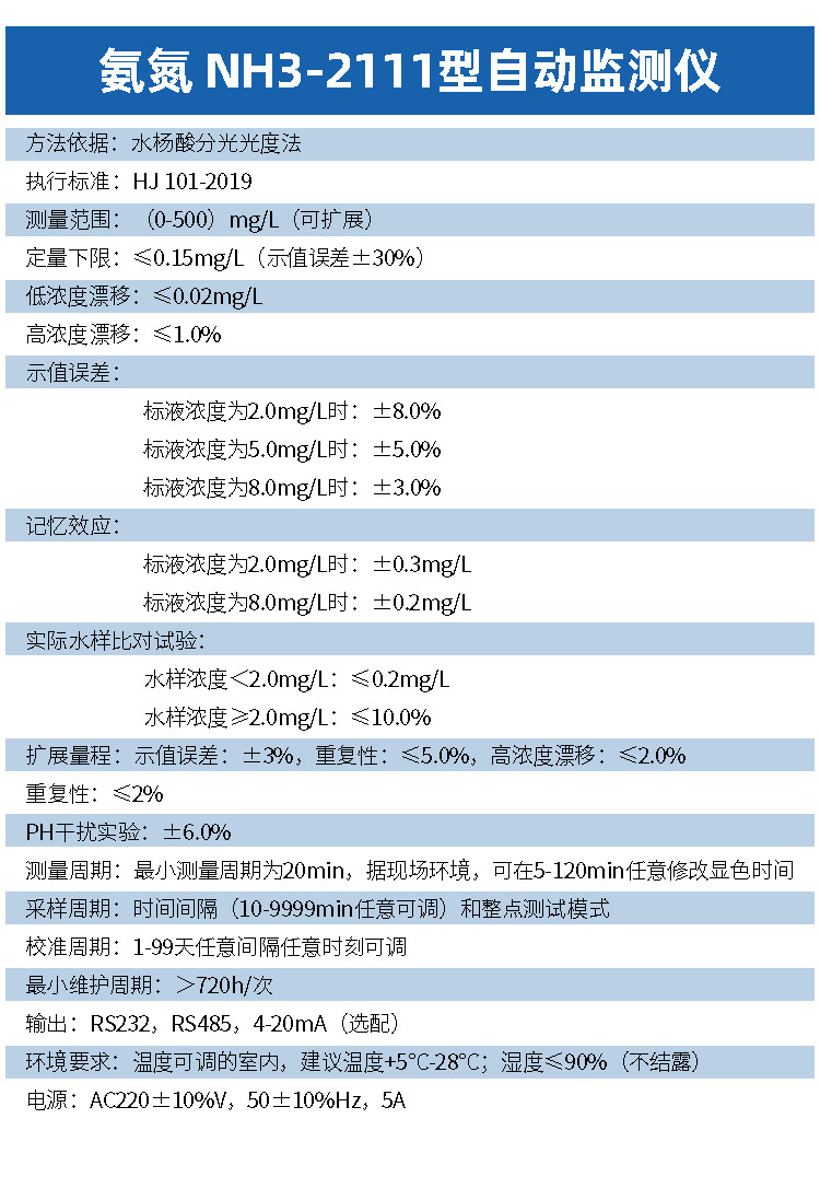 比對誤差:±0.05mg/L(NH3-N≤1.0mg/L);±10%(NH3-N>1.0mg/L)。